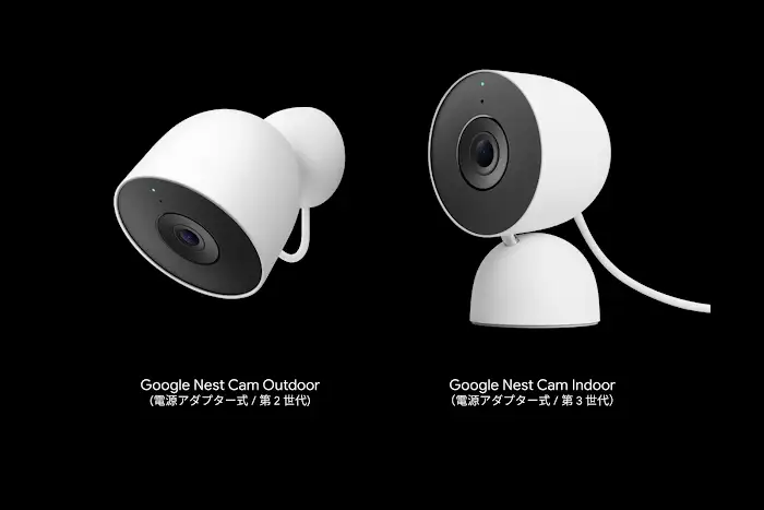 | Google Nest Cam Outdoor(電源アダプター式 / 第 2 世代) | Google Nest Cam Indoor(電源アダプター式 / 第 3 世代) | |