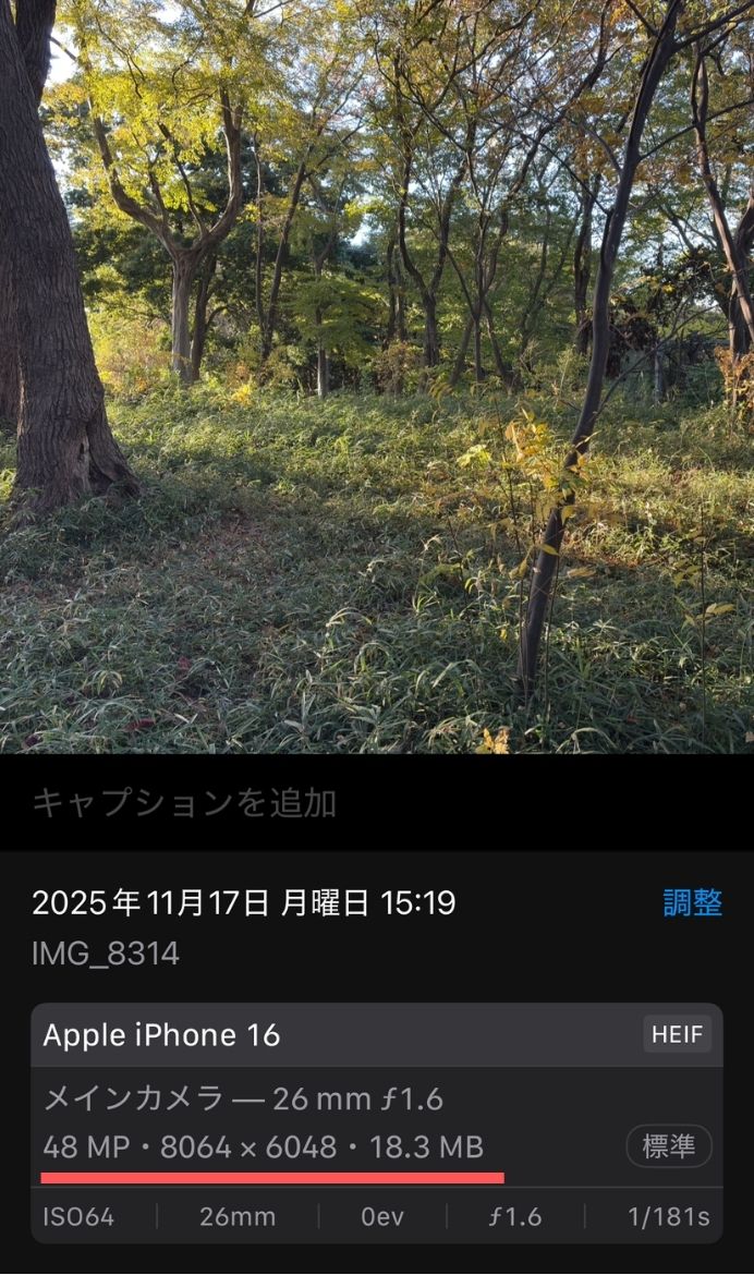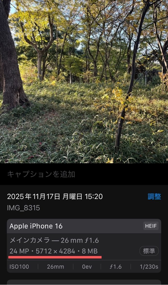 個人的にはiPhone 16から新しくなった「フォトグラフスタイル」との相性を考えて、48MPのHEIFで撮っています。